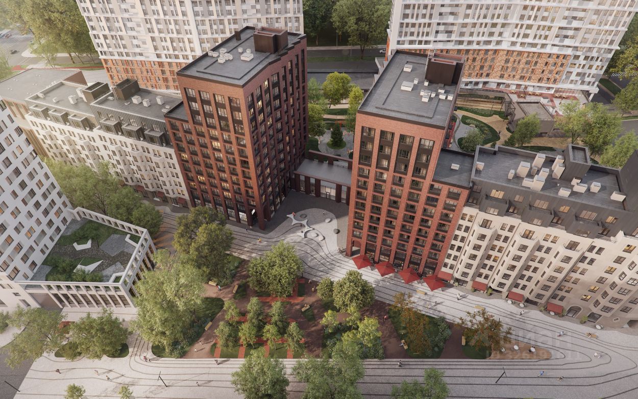 Здания комплекса примыкают друг другу торцами и создают единую архитектурную форму. Дома по обе стороны бульвара задают направление для прогулок, а волнообразный рисунок брусчатки и плавные изгибы делают бульвар похожим на русло реки. Каждый дом комплекса отличается от другого этажностью, формой, цветом, геометрией фасада.