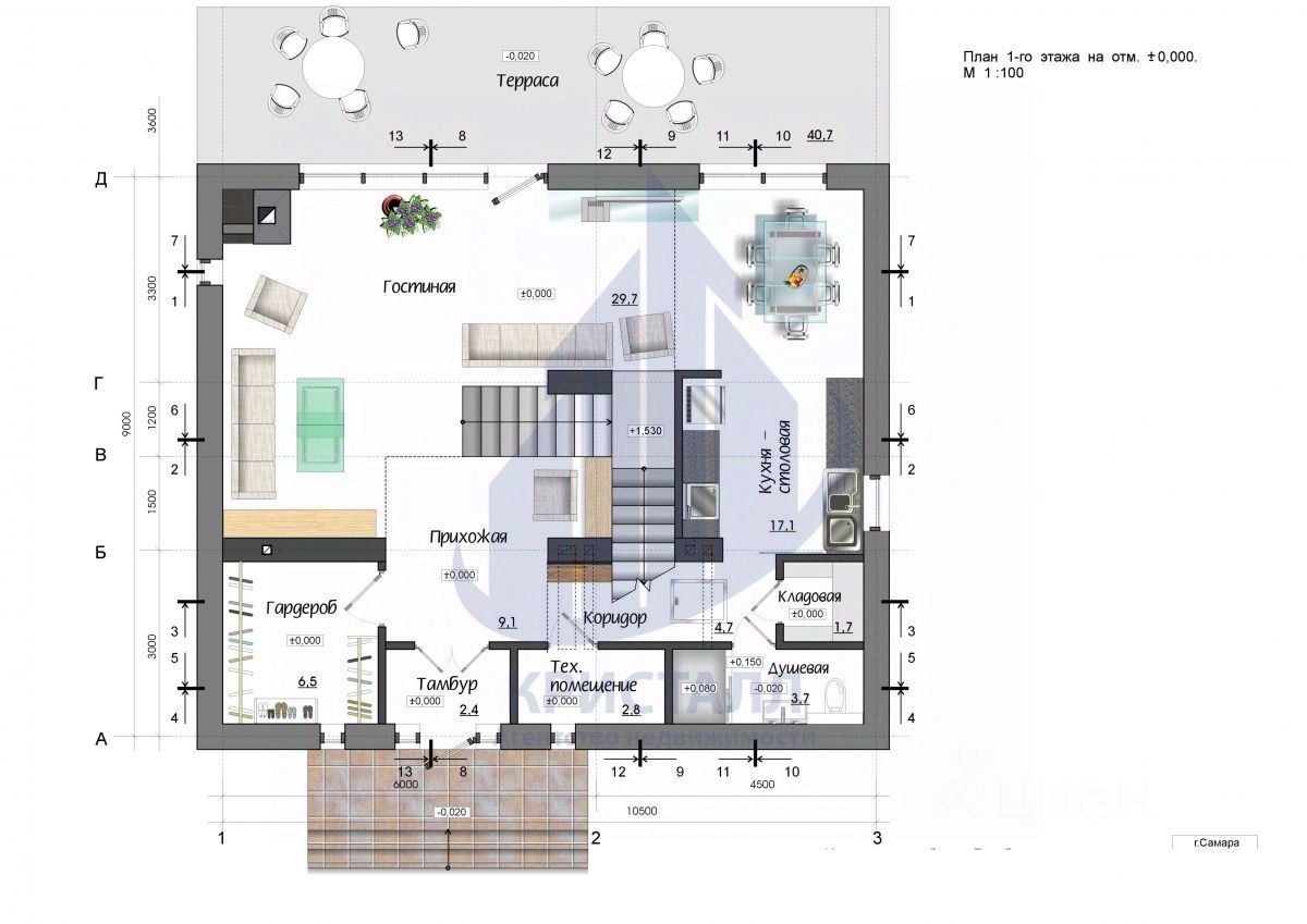 Первый этаж: Просторная гостиная с витражными окнами и камином, кухня, гардеробная, санузел с душевой кабиной, прачечная, выход на террасу с видом на Волгу.