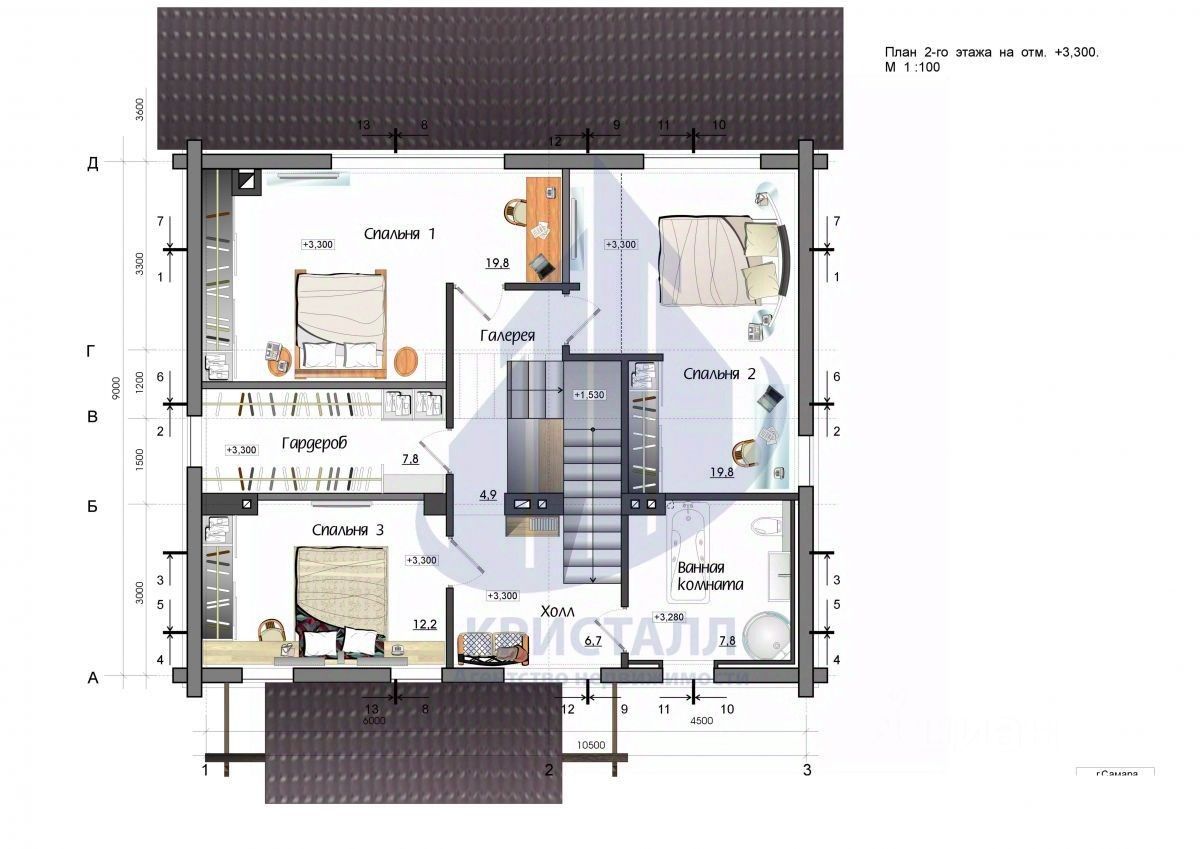 Второй этаж: Три уютные спальни, санузел с ванной и душевой кабиной.
