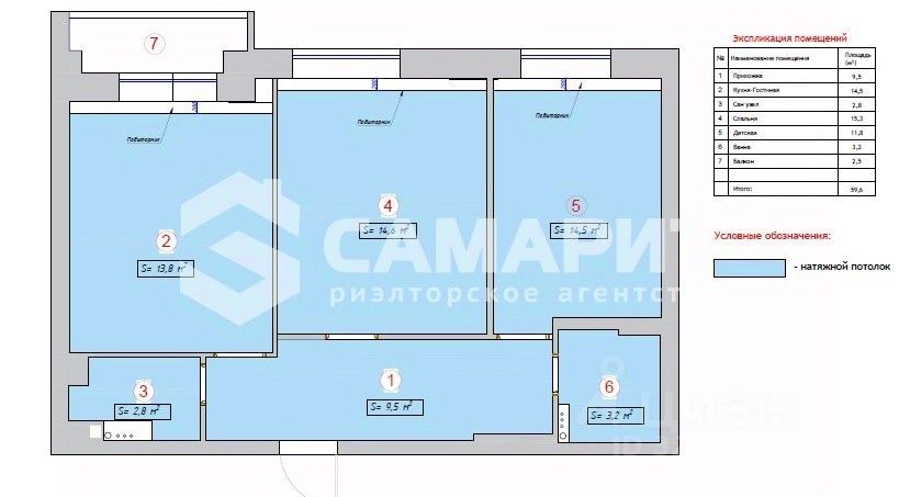 Общая площадь: 56,7 (без учета площади балкона+60 кв.м). Кухня: 14,5 кв.м. Жилая: 28,4 кв.м