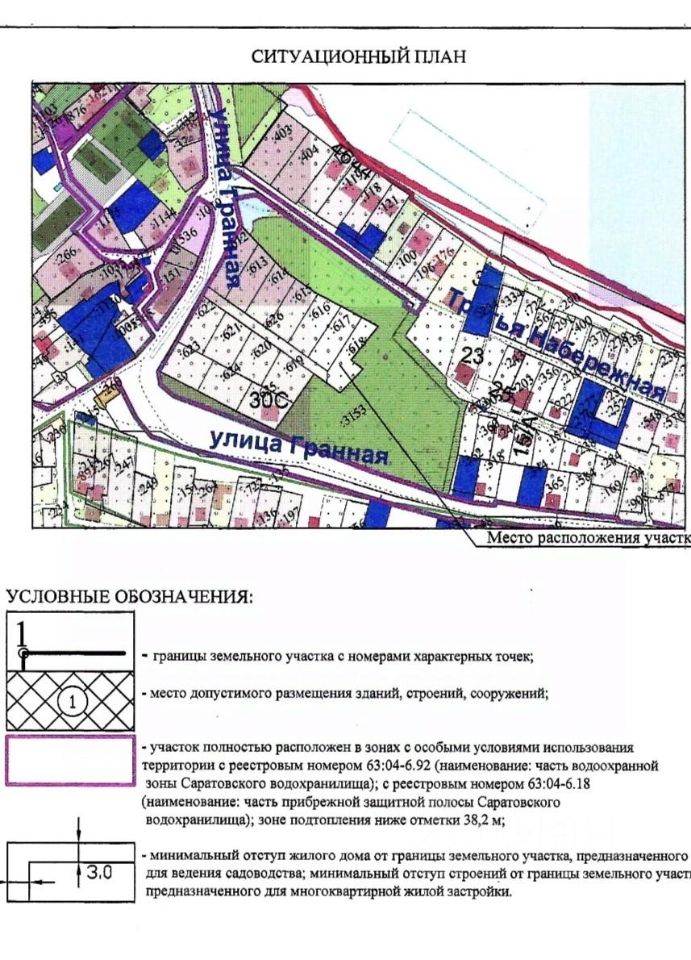 Продается земельный участок 63:04:0101004:618 в Гранном 970 кв.м. Вторая линия от Волги, заезд на участок с ул. 3-я набережная. На участок получено ГПЗУ - по которому возможна и разрешена жилая застройка, до 3-х этажей. Рядом магазин Магнит, пляж и автобусная остановка 41, 42, 119 автобусов, к участку относится так же дополнительно часть проезда - около 2 соток (63:04:0101004:626) . Газ и электричество расположены по границе участка. Документы готовы к продаже, участок очищен от деревьев и поросли.