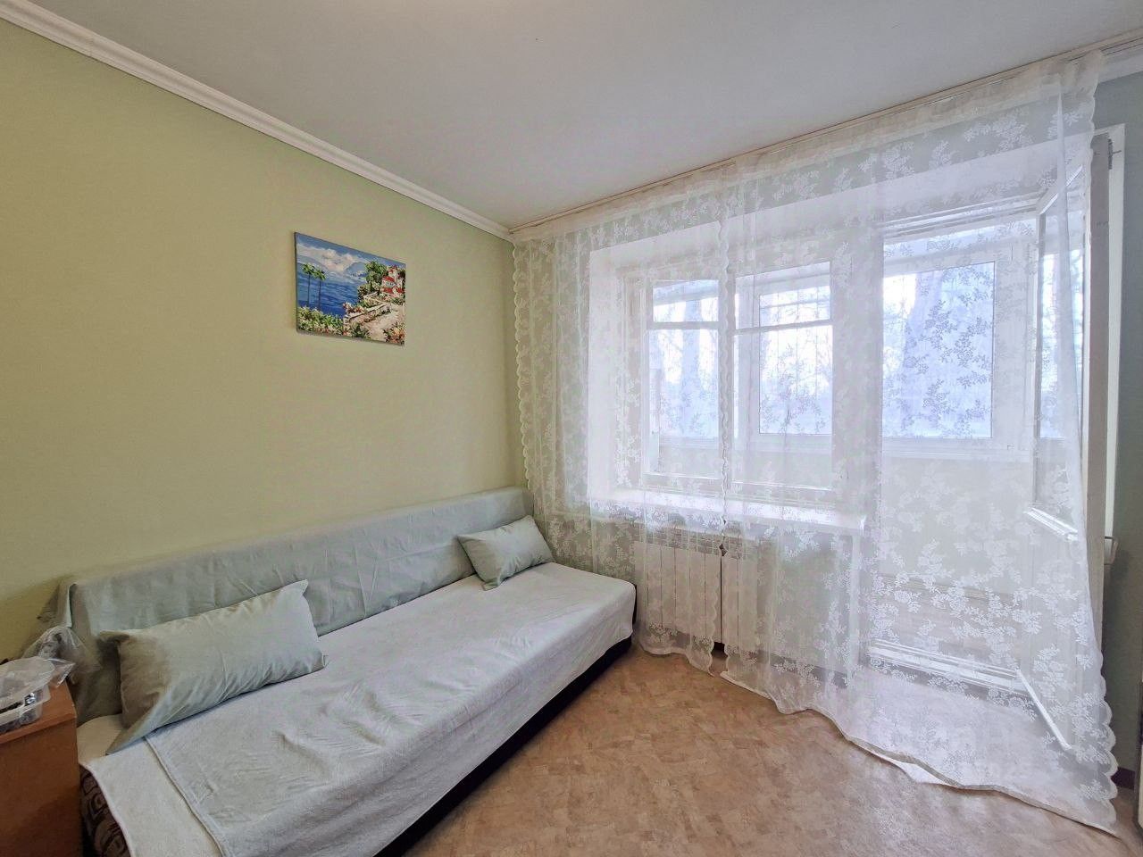 Комната светлая и уютная, окна выходят на скверик, за которым располагается Заводское шоссе. Санузел совмещенный. Две совмещенные лоджии площадью около 7 кв.м., где можно организовать зону отдыха или хранить сезонные вещи. Дом находится в хорошем состоянии. Наземная парковка рядом с домом позволяет легко найти место для автомобиля.