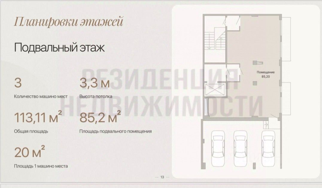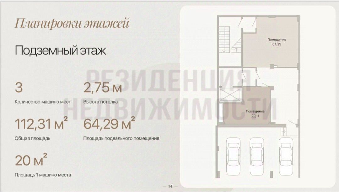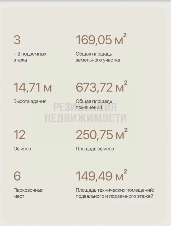 Площадь помещений:Первый этаж: 107,47 м²Второй этаж: 166,74 м²Третий этаж: 164,06 м²Подвальный этаж: 113,11 м²Подземный этаж: 112,31 м²