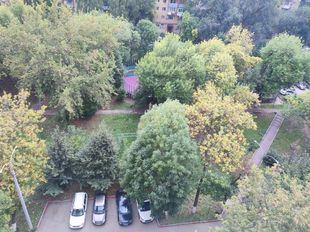 У дома очень зелёный большой двор. Во дворе детская площадка, спортивная площадка, площадка для собак, каток (который летом - футбольная и баскетбольная площадки).
