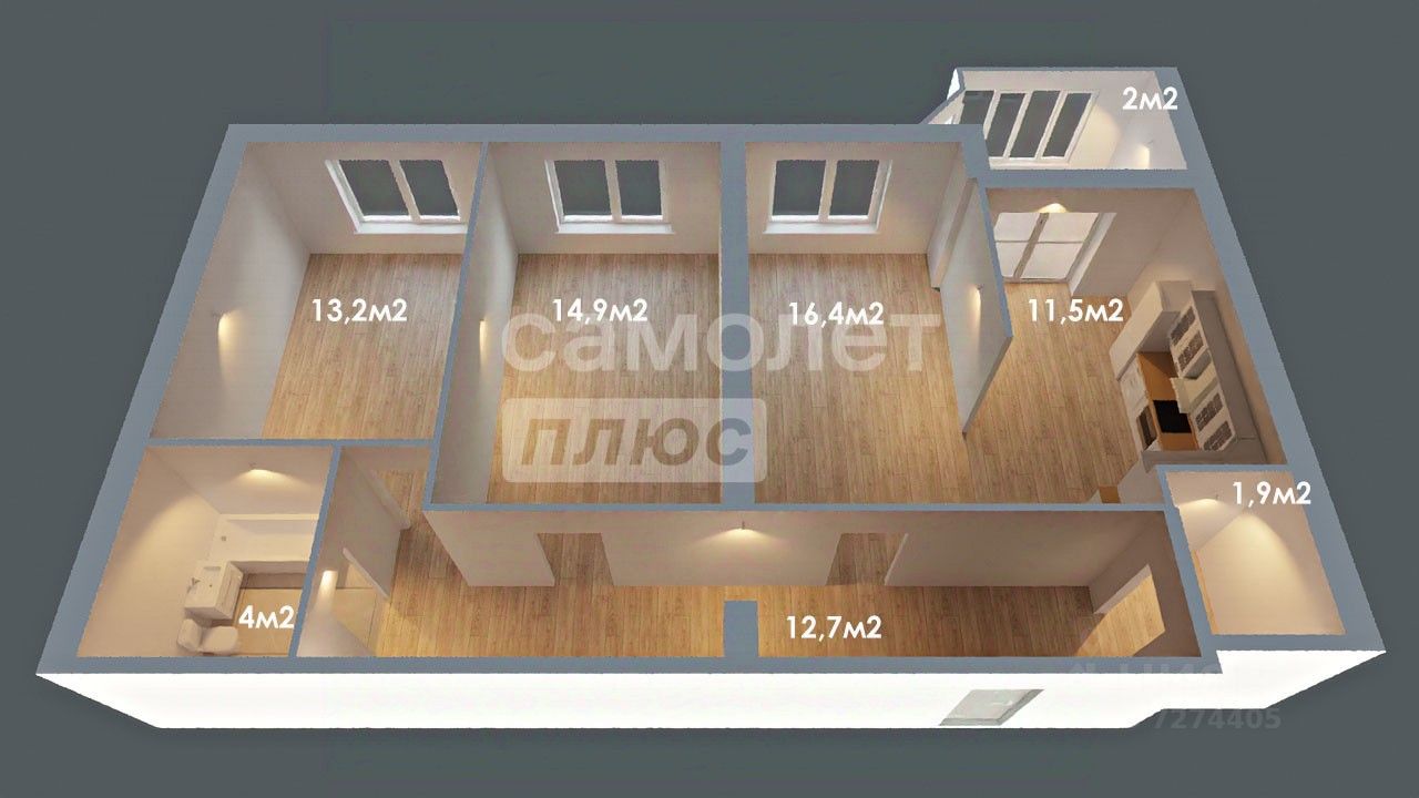 Просторная жилая зона площадью 44,5 квадратных метров, удобная планировка комнат (13,2 + 14,9 + 16,4 м²) и кухни площадью 11,5 м² Удобная кухня-гостиная, готовая принять ваших гостей Санузел совмещён, просторный и функциональный Наличие собственной лоджии площадью 4 м²расширяет пространство отдыха Парковочные места обеспечены комфортом благодаря закрытой территории комплекса